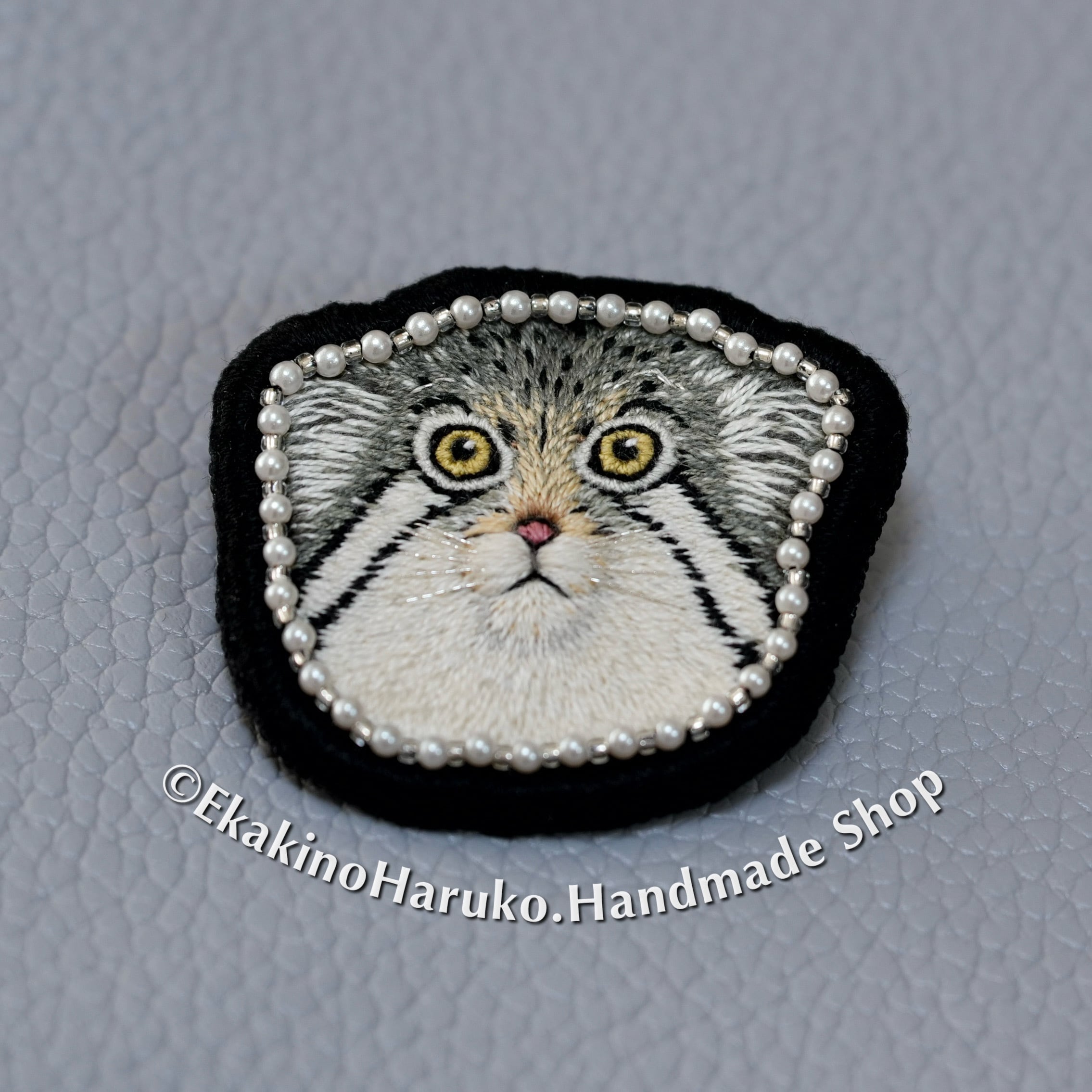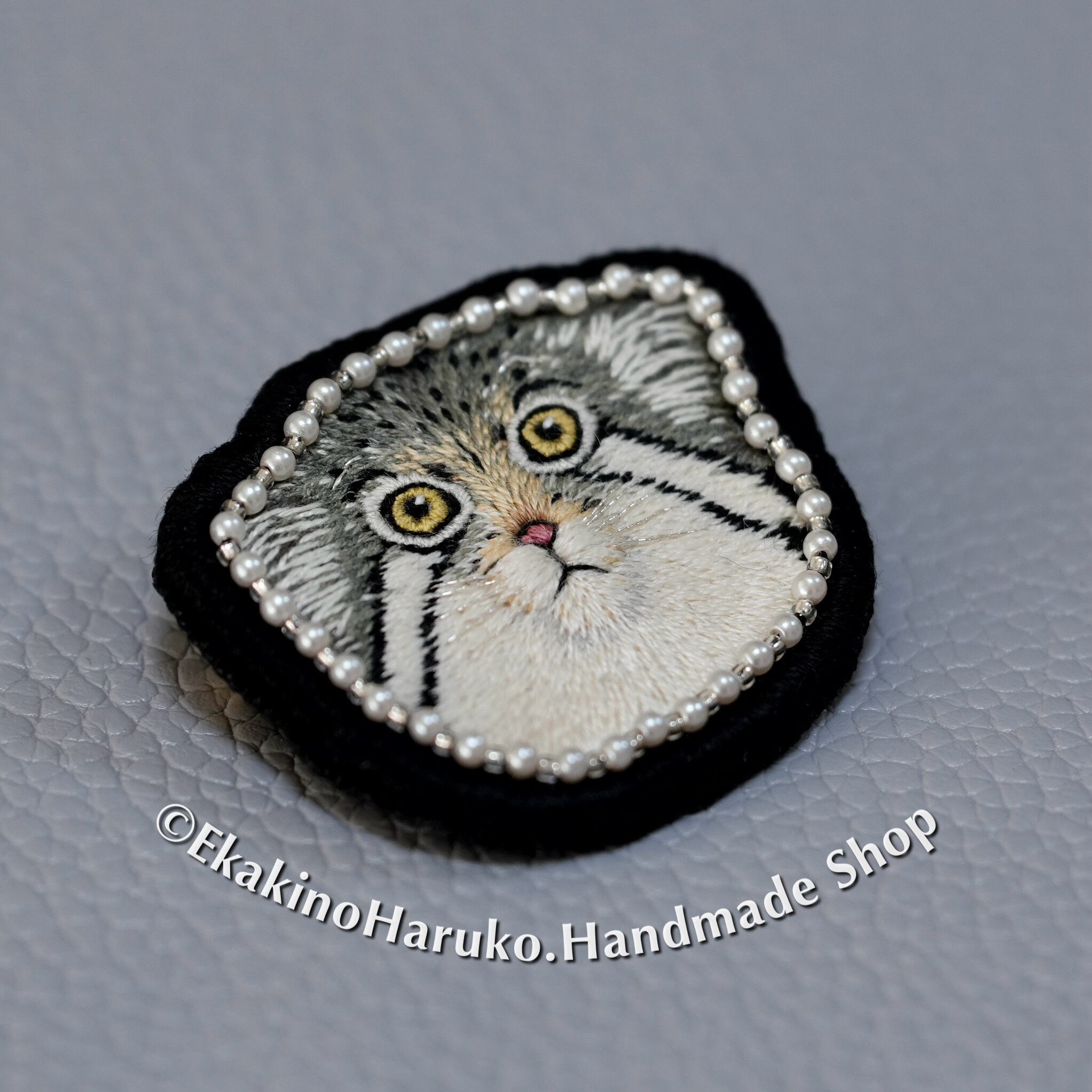 マヌルネコのウラーくんのお顔を、一本どりで丁寧に刺繍したブローチです。